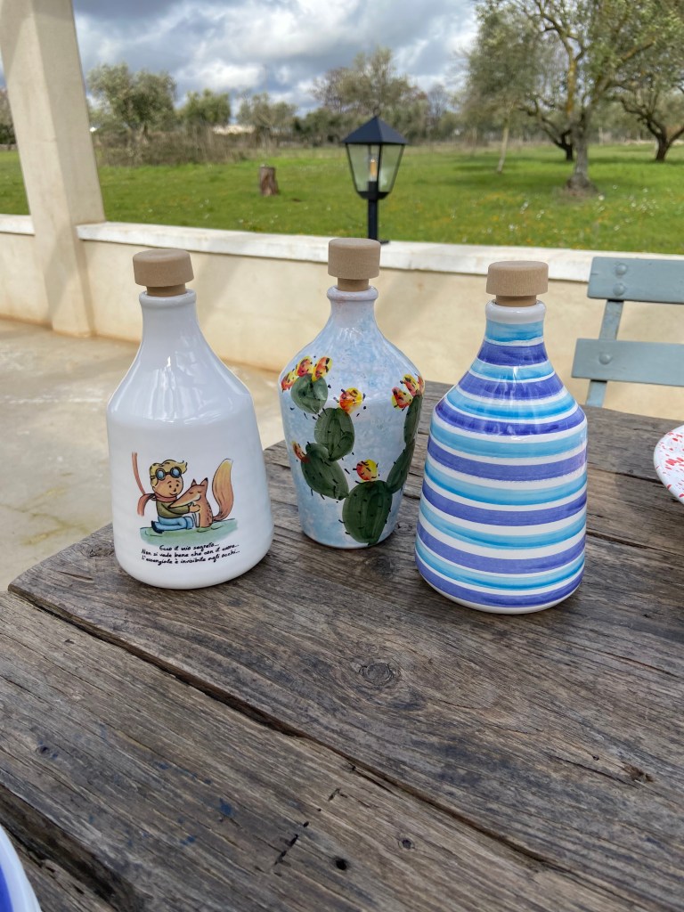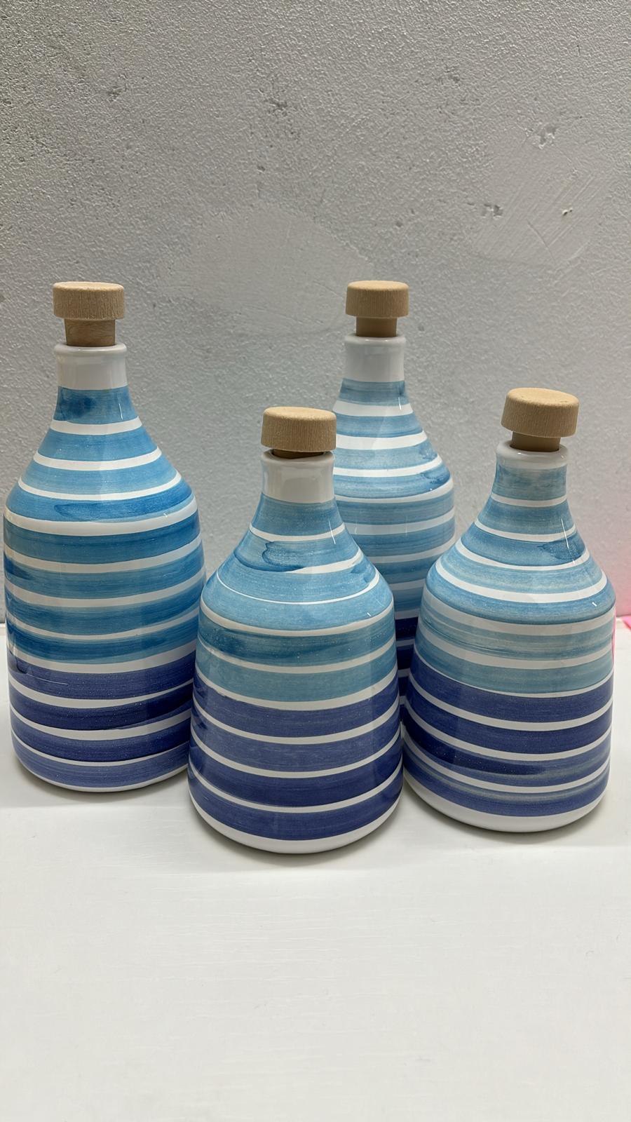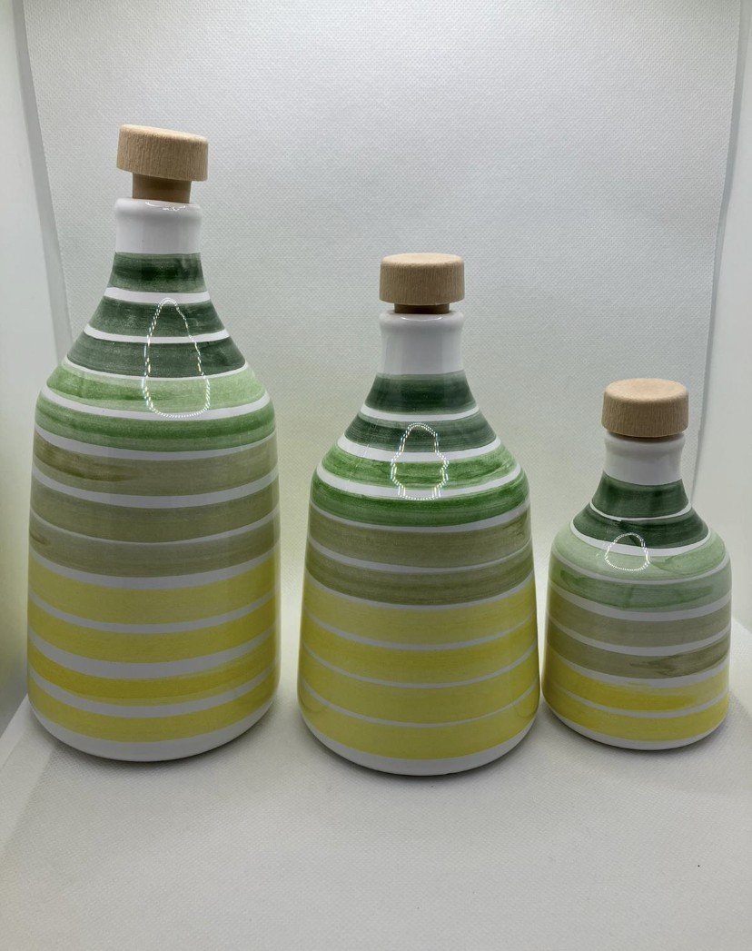 Les “oliere” de différents formats, dès 250ml, 450ml et 650ml en céramique, et toujours fabriquées à la main. Raison pour laquelle les stocks se renouvellent au fur et à mesure des commandes. Les huiliers peuvent aussi être personnalisés pour un évènement.