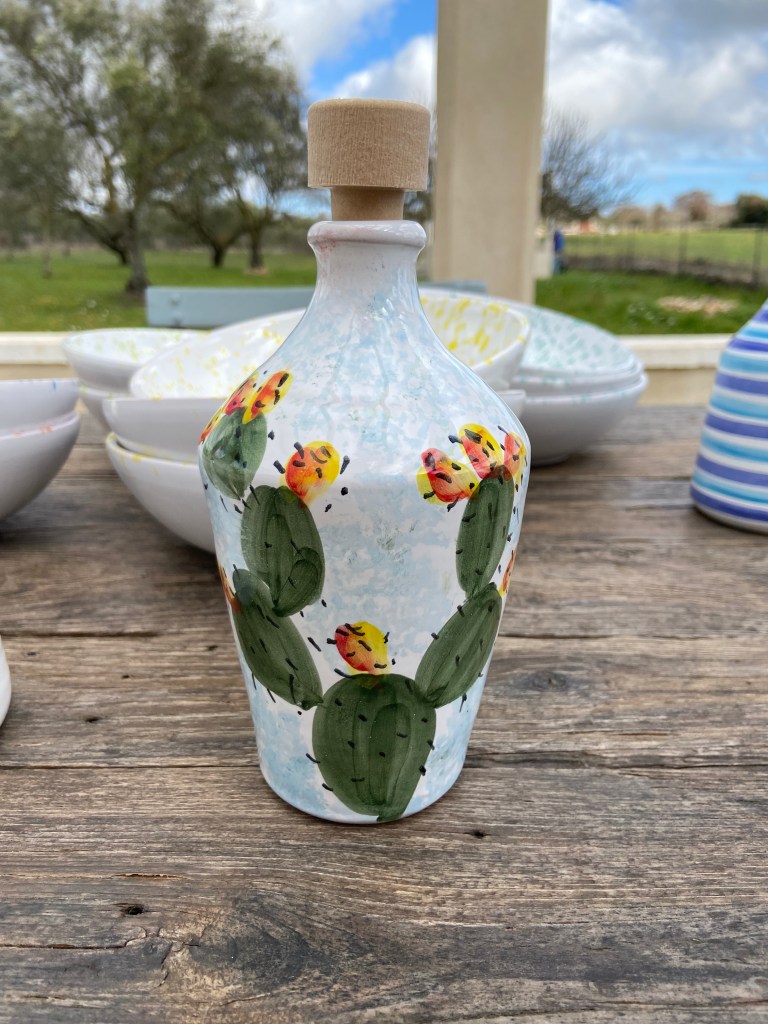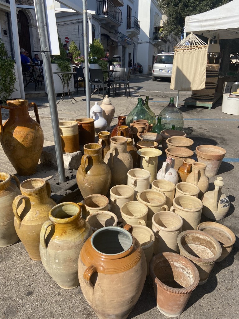 Le fait main 100% pour la céramique, art de la table, déco et insolites. Le verre pour mes dame Jeanne qui proviennent toutes des Masserie locales. Ou encore le bois et le métal pour les objets dénichés sur les “mercati”.